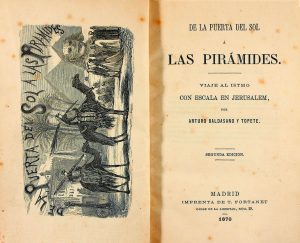 1870. (VIAJES). BALDASANO Y TOPETE, ARTURO: DE LA PUERTA DEL SOL A LAS PIRAMIDES. VIAJE AL ITSMO CON ESCALA EN JERUSALEN. Madrid: Imp. de T. Fortanet, 1870. 8º. Frontispicio y 2 h. + 135 p. Enc. tela moderna.