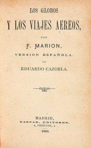 1883. (VIAJES). MARION, F.: LOS GLOBOS Y LOS VIAJES AEREOS. Versión española por Eduardo Cazorla. Madrid: Est. Tip. de los Sucesores de Rivadeneyra / Gaspar, Ed., 1883. 8º. 230 p. 31 figuras. Tela moderna con tejuelo.