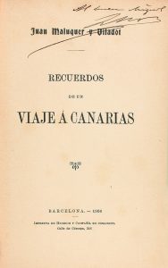 1906. (VIAJES-CANARIAS). MALUQUER Y VILADOT, JUAN: RECUERDOS DE UN VIAJE A CANARIAS. Barcelona: Imp. Henrich y Comp., 1906. 4º menor. 200 p. Enc. moderna en tela, tejuelo. Dedicatoria manuscrita.