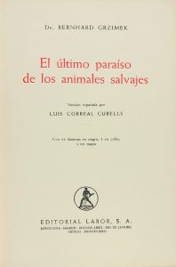 CA. 1930. (CAZA-ANIMALES SALVAJES). GRZIMEK, BERNHARD: EL ULTIMO PARAISO DE LOS ANIMALES SALVAJES. Barcelona: Ed. Labor, s.a. 8º mayor. 198 p. Profus. ilustr. con fotografías en lám. fuera del texto. Enc. en tela edit. Ex- libris.