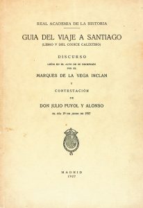 1956. (VIAJE). VEGA INCLAN, MARQUES DE LA: LIBRO DEL VIAJE A SANTIAGO (LIBROS V DEL CODICE CALIXTINO). Discurso leído en el Acto de su recepción, por el ...y contestación de Don Julio Puyol y Alonso, el día 19 de Junio de 1927. Madrid: Imp.: V....
