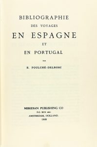 1969. (VIAJES). FOULCHE; DELBOSC: BIBLIOGRAPHIE DES VOYAGES EN ESPAGNE ET PORTUGAL. Amsterdam: Meridiam Publishing, 1969. 4º. 349 p. Enc. tela editorial. Se colacionan 858 obras. Reimpresión íntegra de la edición de Paris, 1896.