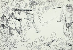 1978 ca. (VIAJES-ROBINSON). ARTIGAU: CONJUNTO DE 21 ORIGINALES PARA LA OBRA ROBINSON CRUSOE. Tionta sobre cartoné. 31x44 cm. aprox. cada unidad.Obra editada por Nauta.