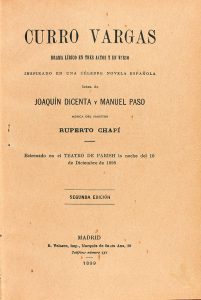 1899. (MUSICA-ENCUADERNACION). DICENTA, JOAQUIN; PASO, MANUEL; CHAPI, RUPERTO: CURRO VARGAS. DRAMA LIRICO EN TRES ACTOS Y EN VERSO INSPIRADO EN UNA CELEBRE NOVELA ESPAÑOLA. Madrid: R. Velasco, imp. de Marques de Santa Ana, 1899. 8º mayor. 129 p....