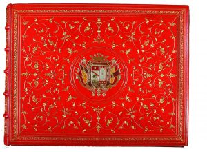 firmas manuscritas de las mujeres del patronato. En la portada un dibujo original de un angelote. Bellísima encuadernación firmada por Subirana en plena piel roja, decoraciones en dorado en los planos, y escudo en mosaico en el plano anterior. Presentado en una caja de época, en piel con gofrados.