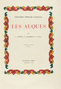 1931. (BIBLIOFILIA). AMADES, JOAN; COLOMINAS; VILA: IMATGERIA POPULAR CATALANA. LES AUQUES. Barcelona: Ed. Orbis, 1931. 2 vols. en folio. I: 198 p., LV. Ilustr.; II: 100 AUCAS FACSIMILADAS con comentarios de las mismas. Portadas orladas a color....