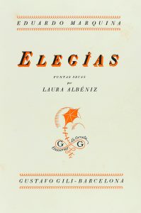 1935. (BIBLIOFILIA-LITERATURA). MARQUINA, EDUARDO: ELEGIAS. Barcelona: Gustavo Gili, 1935. 4º, 232 p., 2 h. Ilustr. con puntas secas de Laura Albéniz. Enc. en plena piel, nervios, hilos y corte superior dorado. Conserva cubiertas originales....
