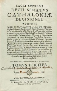 1686. (CATALUNYA). SACRI SUPREMI REGII CATHALONIAE SENATUS DECISIONES. TOMUS I y III. I: Barchin.: Ex Typographia Raphaelis Figueró, 1686. 27 h. + 760 p., 40 h. aprox. [Más:] IDEM TOMUS TERTIUS. 26 p. + 595 p., 100 p. aprox. Los dos vol....