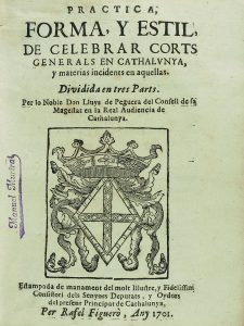 Audiencia. Estampada de manament del molt Illustre y Fidelissim Consistori dels Senyors Deputats, y Oydors del present Principat de Cathalunya, per Rafael Figueró, 1701. 8º mayor. 8 h. + 104 p., 22 h. Marca tipográfica en portada. Enc. pergamino. Ex-libris estampillados de anterior poseedor. Palau 216351.
