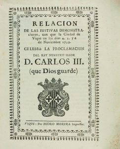 1759. (FIESTAS A CARLOS III, EN VIC). RELACIÓN DE LAS FESTIVAS DEMONSTRACIONES, CON QUE LA CIUDAD DE VIQUE EN LOS DIAS 4, 5, Y 6 DE NOVIEMBRE 1759. CELEBRÓ LA PROCLAMACIÓN DEL REY NUESTRO SEÑOR D. CARLOS III. Vique: por Pedro Morera Impressor...