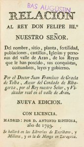 1793. (VALLE DE ARAN). GRACIA DE TOLBA, JUAN FRANCISCO DE: RELACION AL REY DON FELIPE III NUESTRO SEÑOR del nombre, sitio, planta, fertilidad, poblaciones, castillos, iglesias y personas del valle de Aran, de los reyes que le han poseido, sus...