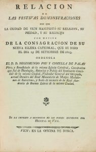 DIA 15 DE SETIEMBRE DE 1803. Vich: en la oficina de Dorca, 1803. 8º mayor. 49 p. Cubiertas de papel. Edición original de este raro impreso. Describe las fiestas que se celebraron en distintas calles y plazas de Vic, con motivo de la consagración de la nueva catedral. A lo largo de la relación se encuentran composiciones poéticas en lengua catalana. Se imprimió este folleto a beneficio de los pobres enfermos del Hospital de Vich. Palau 234142.