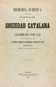 1861. (BARCELONA-PLEITO ENERGIA). MEMORIA JURIDICA EN MANIFESTACION DEL DERECHO QUE ASISTE A LA SOCIEDAD CATALANA DEL ALUMBRADO POR GAS EN EL PLEITO QUE CONTRA LA MISMA SIGUE LA TITULADA COMISION DE CONSUMIDORES PARTICULARES DE GAS. Barcelona: Imp....