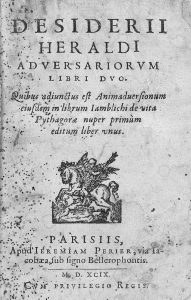 1599. (CIENCIAS). DESIDERII HERALDI ADVERSARIORUM LIBRI DUO. Quibus adiunctus est animadversionum eiusdem in librum... Parisiis: apud Ieremiam Perier, via Iacobaea sub signo Bellerophontis, 1599. 8º menor. 8 h. + 183 p., 5 h. Cabeceras. Señal de...
