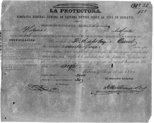 1859. (CUBA-ESCLAVITUD). LA PROTECTORA. COMPAÑIA GENERAL CUBANA DE SEGUROS MUTUOS SOBRE LA VIDA DE ESCLAVOS. 1 h. mitad impresa, mitad manuscrita. Habana, 10 de 1859.
