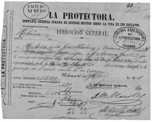 1861. (ESCLAVITUD-CUBA). LA PROTECTORA. COMPAÑIA GENERAL CUBANA DE SEGUROS MUTUOS SOBRE LA VIDA DE LOS ESCLAVOS. 1 h. mitad impresa, mitad manuscrita. Firmado en la Habana, 1 febrero de 1861.