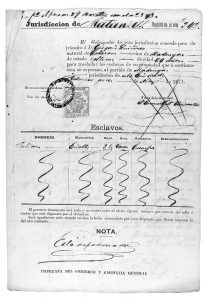 1871. (CUBA-ESCLAVITUD). AUTORIZACIÓN A GREGORIO QUIÑONES PARA EL TRÁNSITO DEL ESCLAVO JULIÁN, CRIOLLO DE 38 AÑOS. Adjunta escrito en el que manifiesta que se equivocó en la solicitud ya que de Sabanilla había puesto que debía de pasar a...