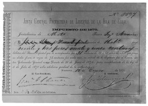 1876. (CUBA-ESCLAVITUD). JUNTA CENTRAL PROTECTORA DE LIBERTOS DE LA ISLA DE CUBA. 1 h. mitad impresa, mitad manuscrita. Firmado en la Habana, 15 de enero de 1876.