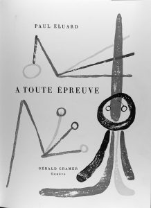 1984. (ARTE-FACSIMIL). ELUARD, PAUL; MIRO, JOAN: A TOUTE EPREUVE. GRAVURES SUR BOIS DE JOAN MIRO. Gèneve: Galerie Patrick Cramer, 1984. Folio. 46 hojas. Cubs. originales protegidas por carpeta y estuche en cartoné. Facsímil de la edición de 1958.