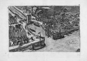 1569-1572-1585. ASTINGER: CONJUNTO DE TRES GRABADOS A DOBLE PAGINA: NIMES, RUREMONDE y [AMERUNGEN]. Grabados al cobre fuertemente coloreados con los márgenes remarginados. 20x29 cm. plancha; 27x37 cm. papel.