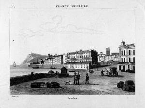 BUTTURA: BARCELONE. Grabado al cobre, coloreado, 13x18 cm. Cat. Soley 419.