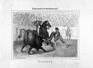 1852 ca. (TAUROMAQUIA). SANTIGOSA, C.: COSTUMBRES ANDALUZAS. PICADOR. Litografía en color, 22,5x31 cm.