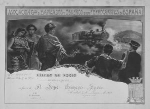 1933. LARA, J.C. DE: TITULO DE SOCIO DE LA ASOCIACION Gral. DE EMPLEADOS Y OBREROS DE LOS FERROCARRILES DE ESPAÑA. Madrid: Imp. Rivadeneyra, 1933. Bella litografía color sépia. 50x71 cm.