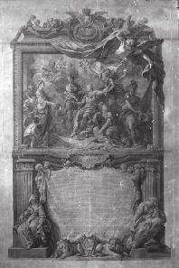 d’après François Lemoyne. Signatures : Franciscus le Moine Pictor Regis primarius inv. et pinxit ; Laurentius Cars ex Academia Regia Sculpsit. Montage sur deux tringles en bois noirci. Pliures, papier bruni, petites taches de peinture. Armand de Rohan-Soubise (1717-1756), prince de Tournon puis abbé de Ventadour apris le nom de Soubise pour se distinguer de son oncle. Élu à 23 ans membre de l’Acadé- mie française en 1741, il fut nommé Cardinal (1747) puis prince-évêque de Strasbourg en 1749. Grand aumônier du Roi, il fut recteur de l’Université de Paris. Le titre de sa thèse : Quaestio theologica : Quis dedit hoc in corde Regis ? est inscrit dans le cartouche sous l’illustration et les positions de la thèse retranscrites sur la feuille inférieure.