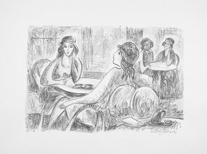 1980 ca. MORATO ARAGONES: EN UN CAFE. Litografía coloreada. 30x41 cm. Firmado a lápiz.