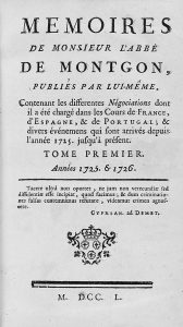 1750-1753. (HISTORIA). MONTGON: MEMOIRES DE MONSIEUR L´ABBE DE MONTGON. S.l.: s.i., 1750. 6 vols. I: XLVIII + 547 p.; II: 494 p.; III: 450 p.; IV: 503 p.; V: 438 p.; VI: 572 p. [Más:] ID.: ID. Laussane: chez Marc-Mic, 1753. 3 vols. en 8º. VI: 448...
