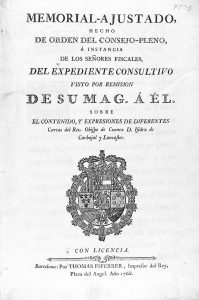 Barcelona: Thomas Piferrer, 1768. 4º mayor. 4 h. + 207 p. Texto a dos columnas. Escudo en portada. Enc. en pergamino.