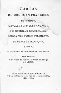 1814. (HISTORIA). CARTAS DE DON JUAN FRANCISCO DE MASDEU, NATURAL DE BARCELONA, A UN REPUBLICANO ROMANO SU AMIGO ACERCA DEL FAMOSO JURAMENTO, YO ODIO A LA MONARQUIA, O BIEN YO JURO ODIO AL GOBIERNO DE LOS REYES. Madrid: Imp. que due de Fuentenebro,...