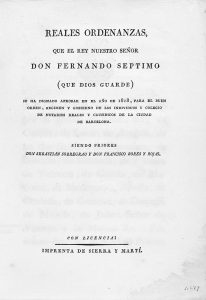 1818. (HISTORIA). SOBREGRAU, SEBASTIAN; BORES Y ROJAS, FRANCISCO: REALES ORDENANZAS, QUE EL REY NUESTRO SEÑOR DON FERNANDO SEPTIMO (QUE DIOS GUARDE). S.l.: Imp de Sierra y Marti, 1818. 8º mayor. 48 p., 4 h. Rústica.