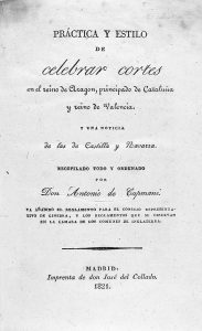 1821. (HISTORIA). PRACTICA Y ESTILO DE CELEBRAR CORTES EN EL REINO DE ARAGON, PRINCIPADO DE CATALUÑA Y REINO DE VALENCIA. Madrid: Imp. de Jose del Collado, 1821. 8º mayor. VII + 356 p. Enc. en media piel.