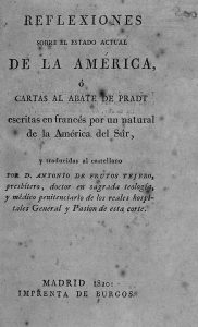 1820. (AMERICA). REFLEXIONES SOBRE EL ESTADO ACTUAL DE LA AMERICA O CARTAS AL ABATE DE PRADT. Trad. Antonio de Frutos Tejero. Madrid: Imp. de Burgos, 1820. 8º menor. 303 p. Puntos de óxido. Enc. moderna en cartoné. Margen interior algo corto.