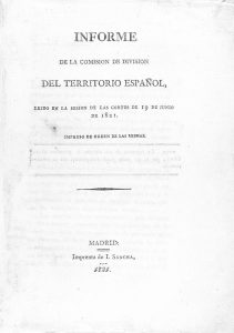 1821. (CONSTITUCION). INFORME DE LA COMISION DE DIVISION DEL TERRITORIO ESPAÑOL, LEIDO EN LA SESION DE LAS CORTES DE 19 DE JUNIO DE 1821. Madrid: Imp. de I. Sancha, 1821. 61 p., apéndice: 46 p., 1 h. Ejemplar en rama con unas cubiertas...