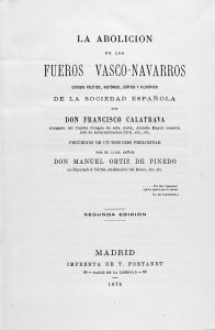 1876. (PAIS VASCO). CALATRAVA, FRANCISCO: LA ABOLACION DE LOS FUEROS VASCO-NAVARROS. ESTUDIO POLITICO, HISTORICO, CRITICO Y FILOSOFICO DE LA SOCIEDAD ESPAÑOLA. Discurso preliminar Manuel Ortiz de Pinedo. Madrid: Imp. de T. Fortanet, 1876. 4º...