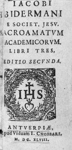 1548. (HUMANIDADES). BIDERMANI, IACOBI: IACOBI BIDERMANO E SOCIET. JESU. ACROAMATUM ACADEMICORUM LIBRI TRES. Antuerpiae: Apud viudam I. Cnobbari, 1548. 12º. 9 h. + 382 p. Portada con marca tipográfica grabada, cortada en el margen superior. Enc....