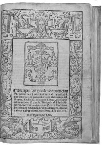 gran tamaño xilográficas. Pergamino de la época. Segunda edición muy rara ( de la primera solo se conoce un ejemplar), de la que solo se conocen cinco ejemplares (dos en España). Tipografía gótica para el texto, y romana para los comentarios e índices. Letras capitales de gran tamaño xilográficas. Portada con gran orla compuesta de cuatro maderas, en el centro escudo de armas del Arzobispo de Granada, Pedro Guerrero. 10 h., 101 folios. Signaturas A-Q6-R5. El último folio manuscrito. Ejemplar lavado y con algunas ligeras restauraciones, márgenes muy cortos. Pergamino antiguo. Segunda edición de extremada rareza. Se había publicado unos años antes (1560) por Antonio de Nebrija, la que se conoce como primera edición ( con una reedición o cambio de portada en 1561). Diego de Ribera, escribano público de Granada trabajó en este libro durante varios años, en la licencia que pide (y le es dada, 26 de Abril de 1559)) al arzobispo de Granada, Pedro Guerrero, explica que las palabras del sermón que por la cuaresma de 1548, dio el Arzobispo le hicieron tomar la determinación de trabajar en el. ´Predicando V.S. de penitencia la quaresma del año de quinietos y cuarenta y ocho. Dixo que estava en estado de pecador, el que estando constituido en algun oficio público, no sabia o procuraba saber lo que a tal oficio convenia [...]´. Las ediciones de esta obra se sucedieron durante el siglo XVI y XVII, y era necesario poseer un ejemplar en las escribanías judiciales o notariales. De esta segunda edición que presentamos solo se conocen escasos ejemplares (cinco ejemplares censados en bibliotecas públicas, solo dos en España) y la mayoría de ellos se encuentran faltos de hojas por su uso. Palau 266803.