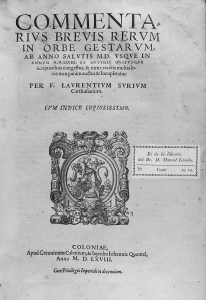 1568. COMMENTARIUS BREVIS RERUM IN ORBE GESTARUM AB ANNO SALUTIS M.D. USQUE IN ANNUM MDLXVIII ES OPTIMUS QUIBUSQUE SCRIPTORIBUS CONGESTUS. Coloniae: apud Geruuinum Calenium, 1568. Folio. 548 p., 14 h. Enc. de época en pergamino. Señal de humedad...