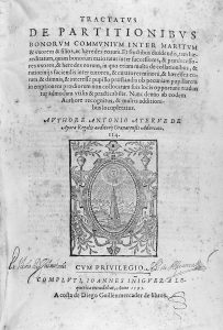 1595. (DERECHO). AYERVE DE AYORA, ANTONIO: TRACTATUS DE PARTITIONIBUS BONORUM COMMUNIUM INTER MARITUM. Compluti: Ioannes Iñiguez, a costa de Diego Guillen mercader de libros, 1595. 4º mayor. 15 h. + 232 fol. Grabado en portada. Texto a dos...