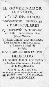 1730. (DERECHO). MANNIA, JOSEPH: EL GOVERNADOR PRUDENTE Y JUEZ INSTRUIDO. DOCUMENTOS GENERALES Y PARTICULARES. Madrid: Juan Muñoz, 1730. 8º menor. 35 h. + 206 p. Enc. de época en pergamino.