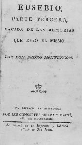1793. MONTEGNON, PEDRO: EUSEBIO... SACADA DE LAS MEMORIAS QUE DEXO EL MISMO. Barcelona: Consortes de Sierra y Martin, 1793. 4 tomos en 2 vols. I: 287 p.; II: 293 p.; III: 316 p.; IV: 309 p. 1 grabado al cobre. Enc. de época en plena piel.