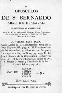 1795. (HUMANIDADES). OPOSCULOS DE S. BERNARDO ABAD DE CLARAVAL. Trad. de Adriano de Huerta. Burgos: Josef de Navas, 1795. 8º mayor. 10 h. + 333 p. Enc. en plena piel, tejuelo, cortes pintados.