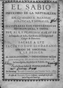 1675. GARAU, FRANCISCO: EL SABIO INSTRUIDO DE LA NATURALEZA EN QUARENTA MAXIMAS POLITICAS, Y MORALES ILLUSTRADAS CON TODO GENERO DE ERUDICION SACRA Y UMANA. Barcelona: en casa de Comellas, por Vicente Surià, a costa de Antonio Ferrer, 1675. 8º...