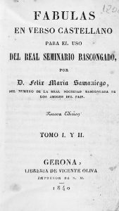 1840. (LITERATURA). SAMANIEGO, FELIX MARIA: FABULAS EN VERSO CASTELLANO PARA EL USO DEL REAL SEMINARIO BASCONGADO. TOMO I Y II. Gerona: Libr. Vicente Oliva, 1840. 12º. X+216 p. Enc. época, semidesprendida, en pergamino.