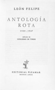 1947. (POESIA). FELIPE, LEON: ANTOLOGIA ROTA. 1920-1947. Epílogo de Guillermo de Torre. Buenos Aires: Ed. Pleamar, 1947. 8º mayor. 265 p. Retrato del autor. Ilustrado con láminas en negro. Enc. tela ed. con sobrecub. Se adjuntan varias hojas en...