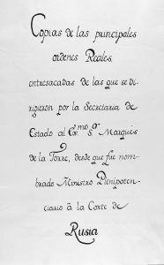 1783 ca. COPIAS DE LAS PRINCIPALES ORDENES REALES, ENTRESACADAS, DE LAS QUE SE DIRIGIERON POR LA SECRETARA DE ESTADO AL EXMO. SR. MARQUES DE LA TORRES, DESDE QUE FUE NOMBRADO MINISTRO PLENIPOTENCIARIO A LA CORTE DE RUSIA. Manuscrito, 60 h....