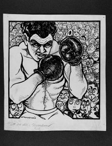 1940 ca. (BOXEO). MONDRAGON [atribuido a]: PLAT DEL DIA ´UZCUDUM´ [PLATO DEL DIA, UZCUDUM]. Tinta y lápiz sobre papel montado en cartoné. 23x20,5 cm.