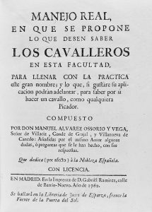 1769. (EQUITACION). ALVAREZ OSSORIO y VEGA, MANUEL: MANEJO REAL, EN QUE SE PROPONE LO QUE DEBEN SABER LOS CAVALLEROS EN ESTA FACULTAD, PARA LLENAR CON LA PRACTICA ESTE GRAN NOMBRE, Y LO QUE GUSTARE SU APLICACIÓN, PODRÁN ADELANTAR, PARA SABER POR...
